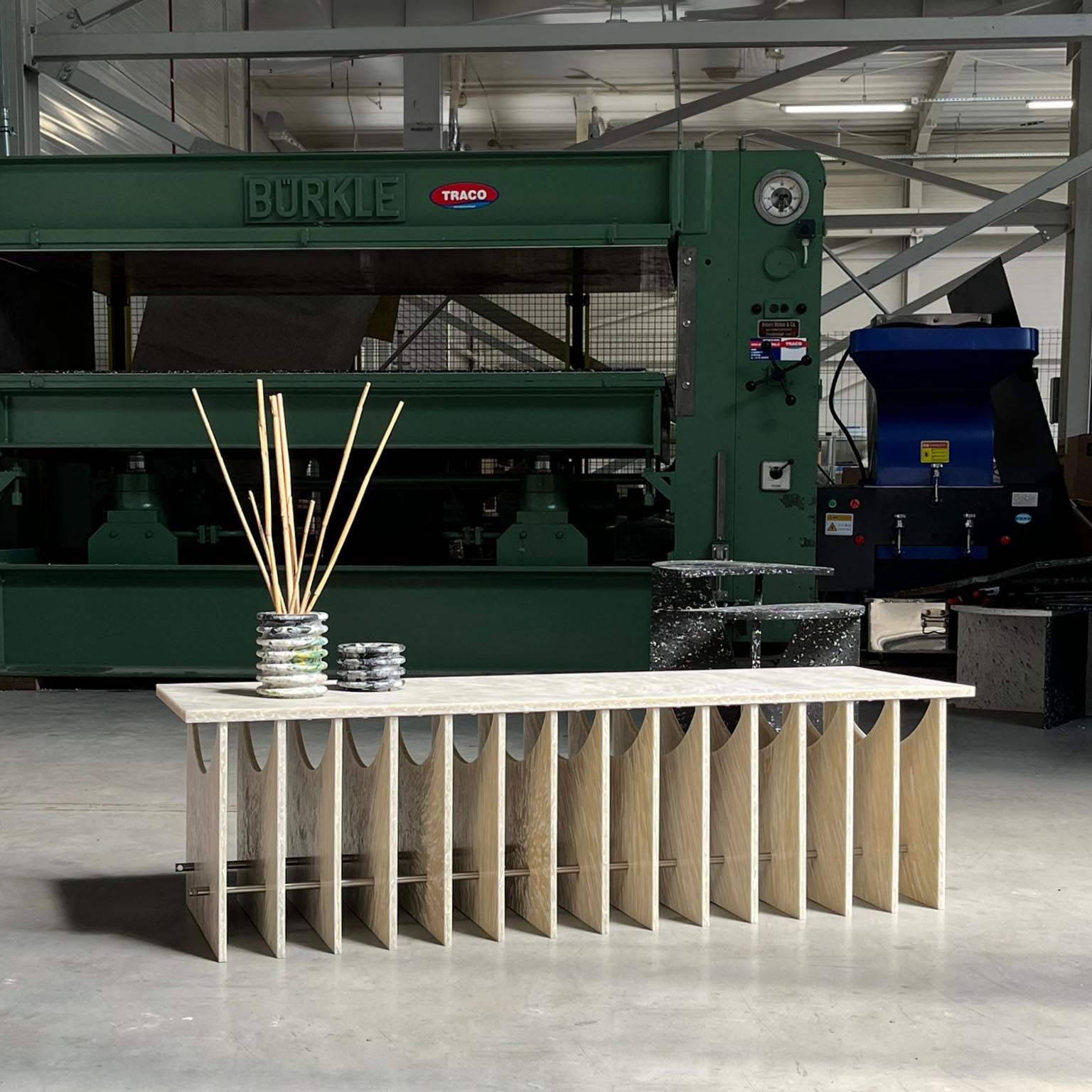 The MASURIA bench project was created with the idea of using the innovative Boomplastic sheet of the same name. This material is made from recycled polypropylene strings from a farm located in Masuria. The used strings contain natural inclusions – in this case reed – which gives the sheet a unique character. The ribbed form of the bench was inspired by the structure of reed straws.
