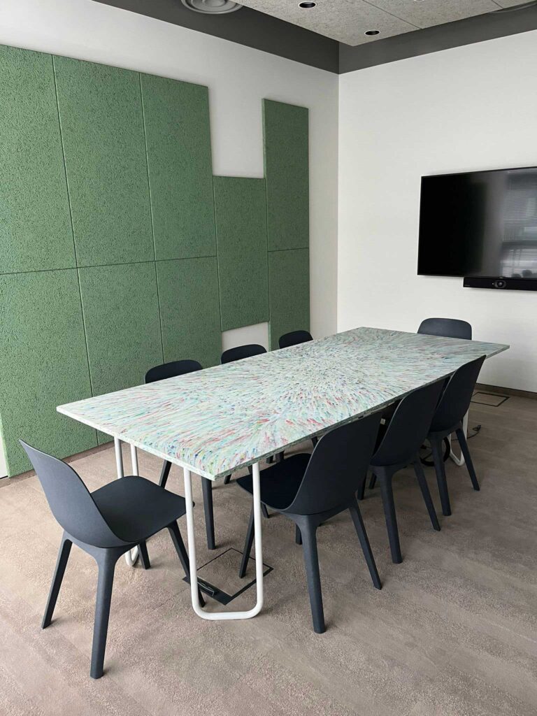There is a unique conference table at the CANAL+ Polska headquarters. Unique because it is made of a unique countertop made of Boomplastic boards! To make it, we used grinding from packaging and grinding from colorful caps.