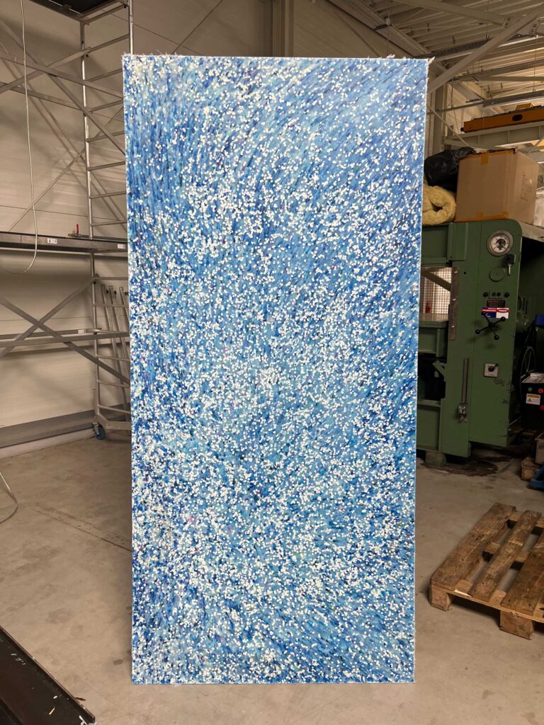 The “Great Blue” panel, made from HDPE regranulates sourced from post-consumer waste, has been designed so that its blue hue isn’t overly intense. We used semi-transparent regranulate and embedded crushed blue caps to achieve a sense of blue depth.