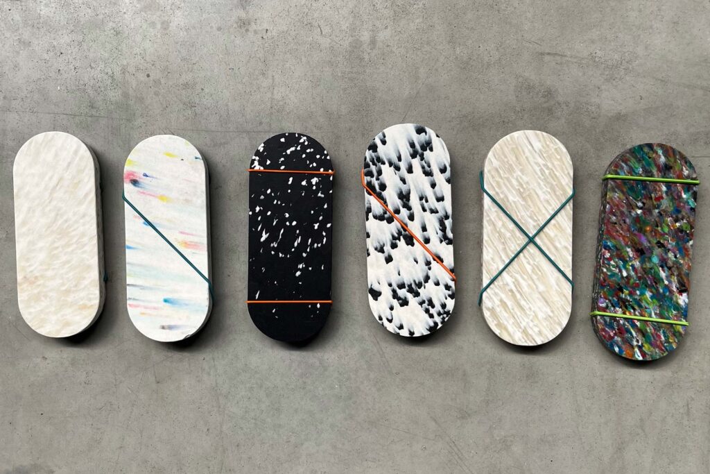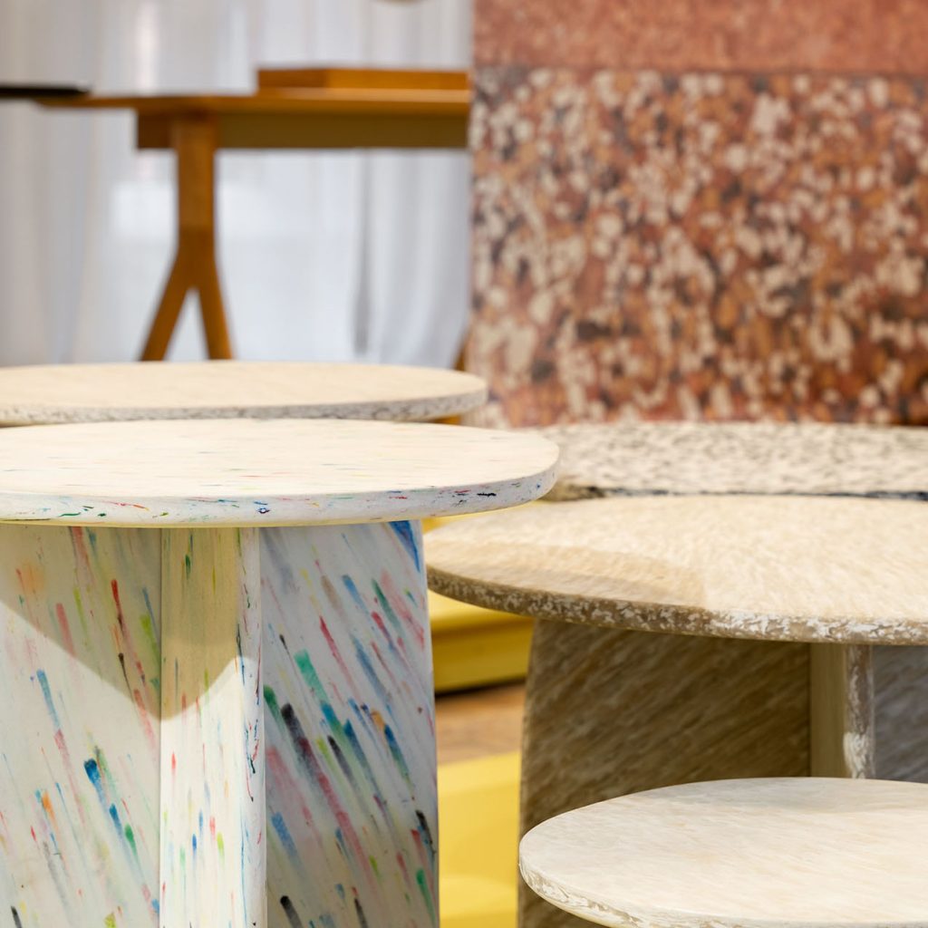 A variety of Boomplastic coffee tables made of different plastic sheets. Entirely made of recycled plastic or with other materials. You can choose a ready-made project, or pick your own table legs and connect them with Boomplastic table top.